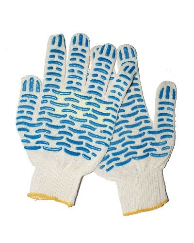 изготовлены из натурального хлопка, а точечки на контактной поверхности из специального полимерного материала. Покрытие из ПВХ позволяет крепко удерживать в руках скользящие материалы, структура покрытия не позволяет предмету вылететь или выскользнуть из руки. . Эти перчатки изготавливаются из 100% натуральной хлопковой нити, что позволяет полностью исключить аллергические реакции на искусственные материалы у рабочих, страдающих аллергией.