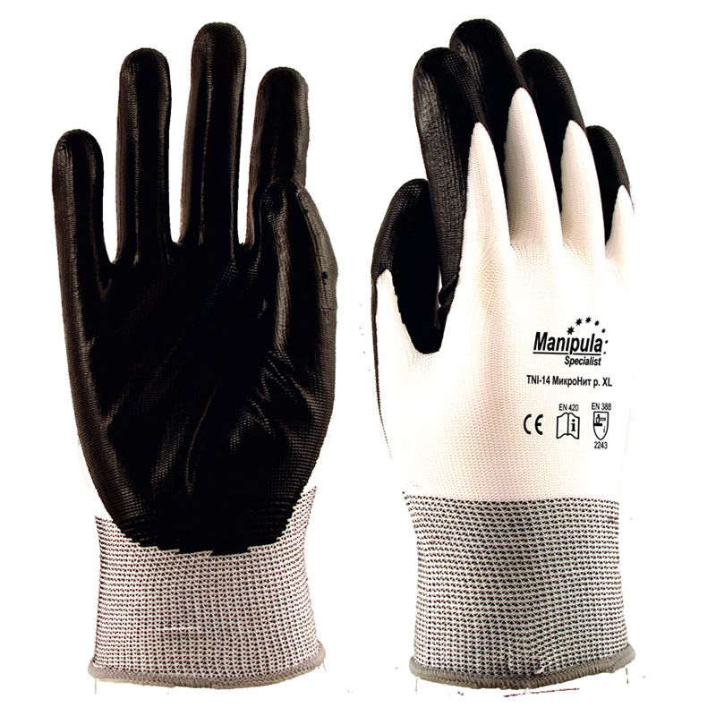 Дл.230-260 мм., категория риска 2,матер.:100% нейлон+нитрил NBR, класс вязки 13, защита ладони от концетраций кислот и щелочей.